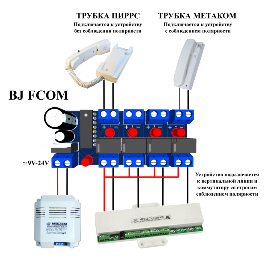 При подлючении трубок Метаком, цифрал и им подобным, даже при неправильном подключении полярности или вовсе короткого замыкания, не вызывает сбой в работе домофонной системы, именуемый в простонародии "Перезвон". Неправильно подключенная трубка просто не будет работать.