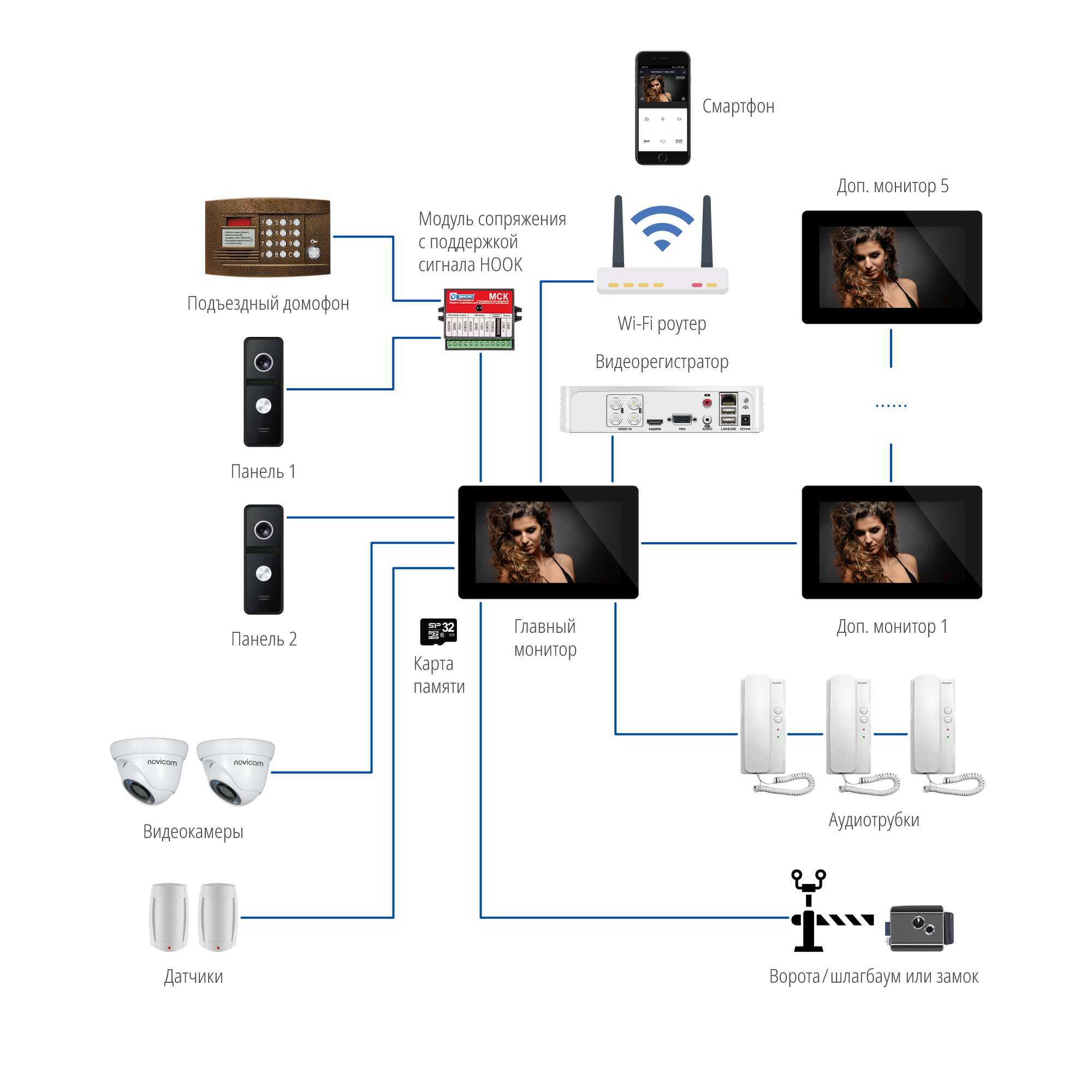 Мониторы Novicam FREEDOM 10 FHD WIFI предназначены для организации домофонной аудио и видео системы совместно с 4-х проводными вызывными панелями. Главной особенностью данного монитора является возможность подключения его к сети интернет для переадресации вызова на смартфон. При желании через мобильное приложение можно посмотреть видео с входной зоны, начать разговор с гостем, открыть замок или ворота. Монитор поддерживает 2 вызывные панели c разрешением видеокамеры до 2 Мп. Сенсорный 10.1" IPS дисплей дает красочное изображение практически при любых углах просмотра. Встроенные микрофон и динамик обеспечивают качественную двустороннюю аудиосвязь. К монитору можно подключить до 5 дополнительных мониторов и до 3 аудиотрубок VOICE, а также использовать его в качестве дополнительного к другим совместимым мониторам. При этом можно общаться в пределах одной системы и переадресовывать вызов с внешней панели на другой монитор. Кроме этого, видеодомофон может использоваться в качестве устройства видеонаблюдения и охраны. Для этого к нему могут быть подключены 2 видеокамеры и 2 датчика, при сработке которых активируются запись фото/видео и звуковая тревога. Для активации записи потребуется MicroSD карта памяти ёмкостью до 128 Гб. Запись видео может осуществляться по детектору движения, вручную или при нажатии кнопки на вызывной панели. Монитор полностью адаптирован для работы с подъездными многоквартирными системами типа Vizit, Cyfral, Eltis, Метаком, Сейф-Сервис, Даксис, Proel, Laskomex, Keyman-Polylock и Маршал-Raikmann через соответствующий модуль сопряжения с поддержкой сигнала HOOK. Видеодомофон станет незаменимым помощником по обеспечению безопасности и контроля доступа в магазинах, складах, квартирах, загородных домах, офисах и прекрасно впишется в любой интерьер.