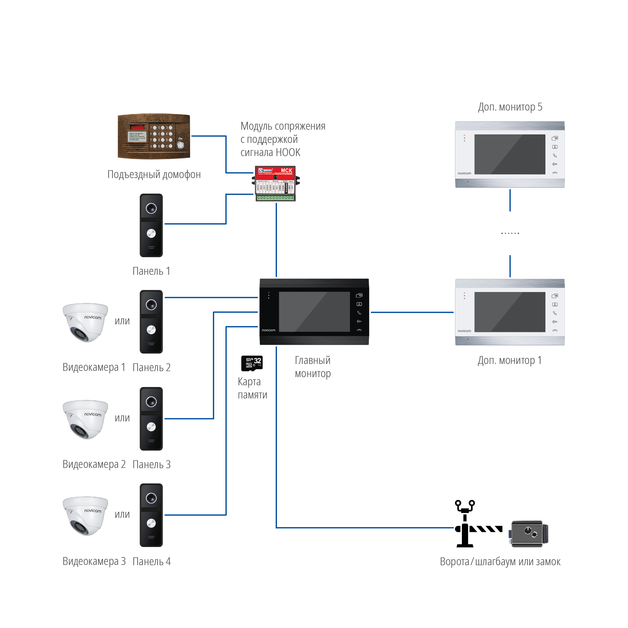 Интерфейс | Управление замком | 1. Через вызывные панели 2. Встроенное электромеханическое реле Н.Р. 2A, DC 12В |