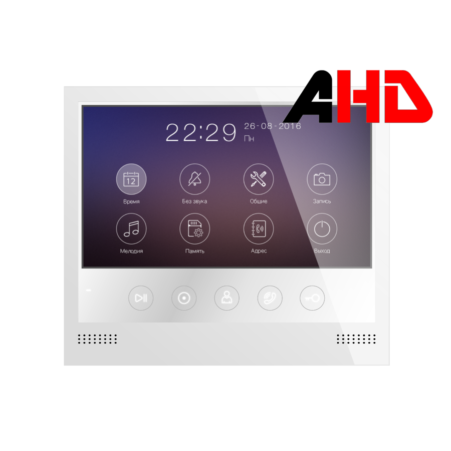 Монитор цветного видеодомофона 7 дюймов с сенсорными кнопками с поддержкой форматов Full HD 1080p, HD 720p, CVBS . Тонкий корпус 14мм со встроенным блоком питания. Возможностью записи фото или видео на microSD карту.